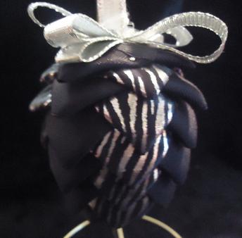 #764. Folded fabric pinecone with black and silver and black striped fabric. 3". $5.00 Shipping Additional