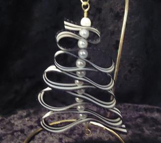 #75. Black and white stripes ribbon Christmas tree ornament with round pearl beads. 4 1/2". $1.50 Shipping Additional