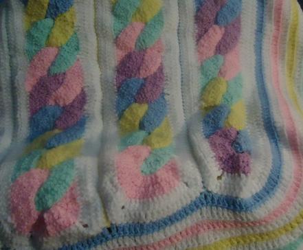 #41. Crocheted baby blanket with pastel yellow, blue, pink, green, purple and white yarn. 35"x52". $35.00 Shipping Additional