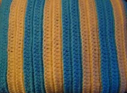 #50. Crocheted pillow with turquoise and light yellow yarn. 15"x 10 1/2". $9.00 Shipping Additional