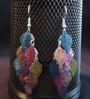 #355. Metal blue, purple, yellow, pink and brown leaf earrings. $8.00 Shipping Additional
